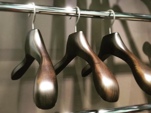 Sartorial enthusiasts know that a well-shaped hanger preserves and reconditions garments after each wear. And, there is only one way for the collar of, say, a fine suit to be supported perfectly, and that is to finely contour the neck of each hanger by hand. To avoid localised fabric stretching or shoulder dimpling, the thick shoulder bars of the hangers ensure there is no unnecessary wear on the garment.
