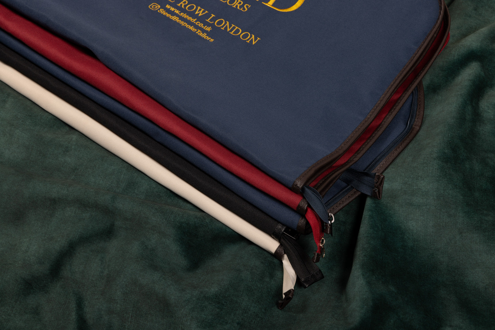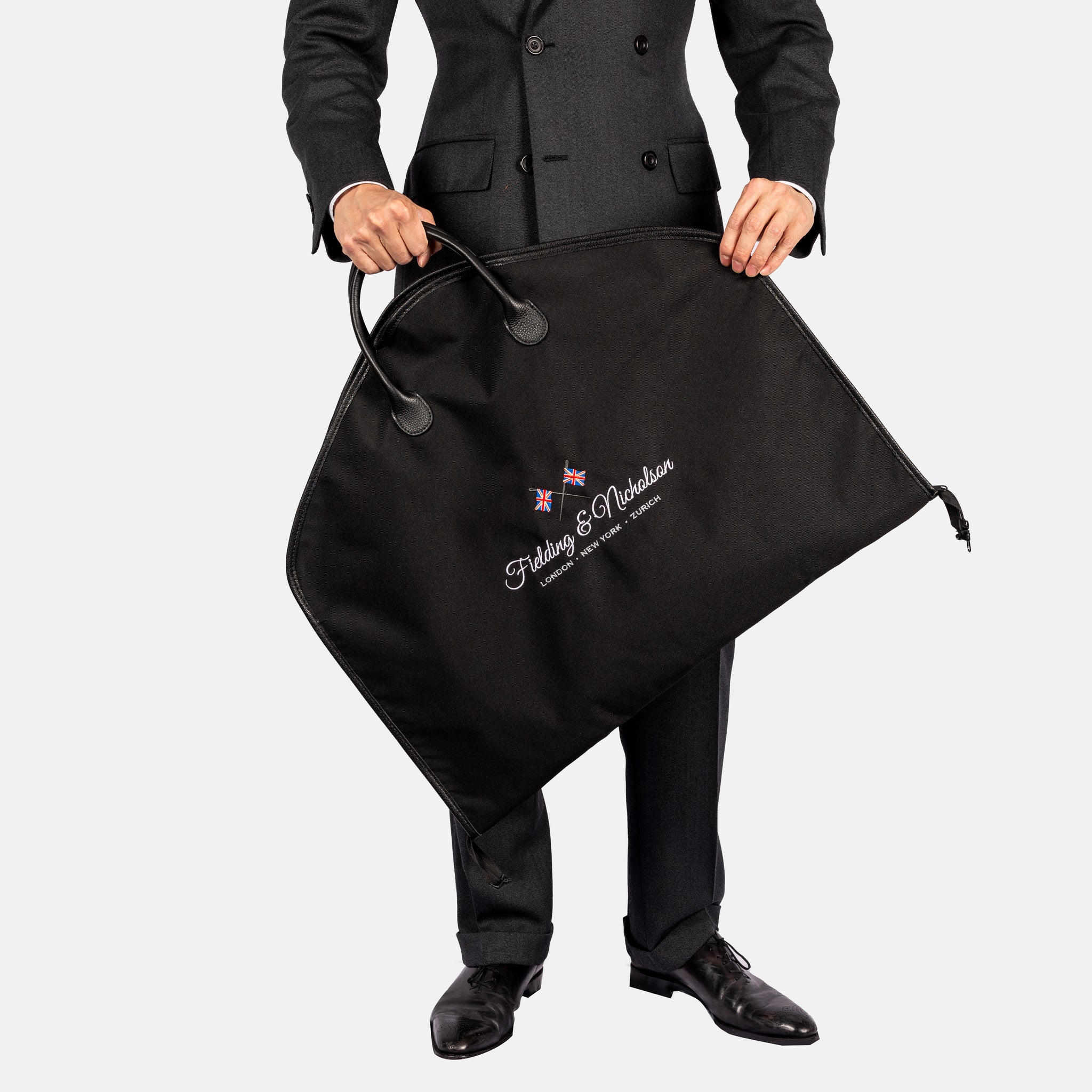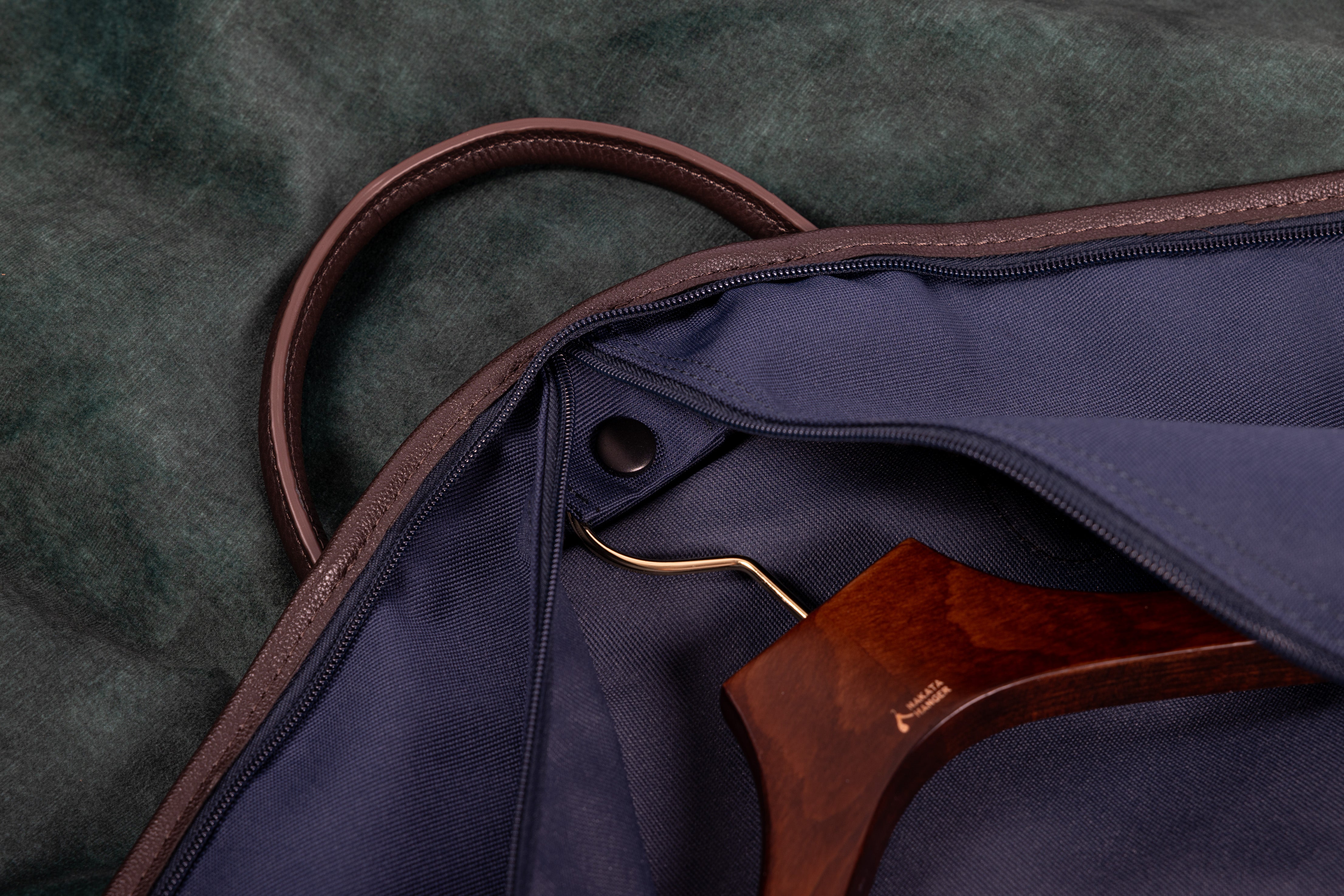 Specific to the Arterton design, we have integrated a heavy duty popper for hanger hooks at the top of the bag. This way the suit stays suspended and hanging, rather than failling to the bottom of the bag.