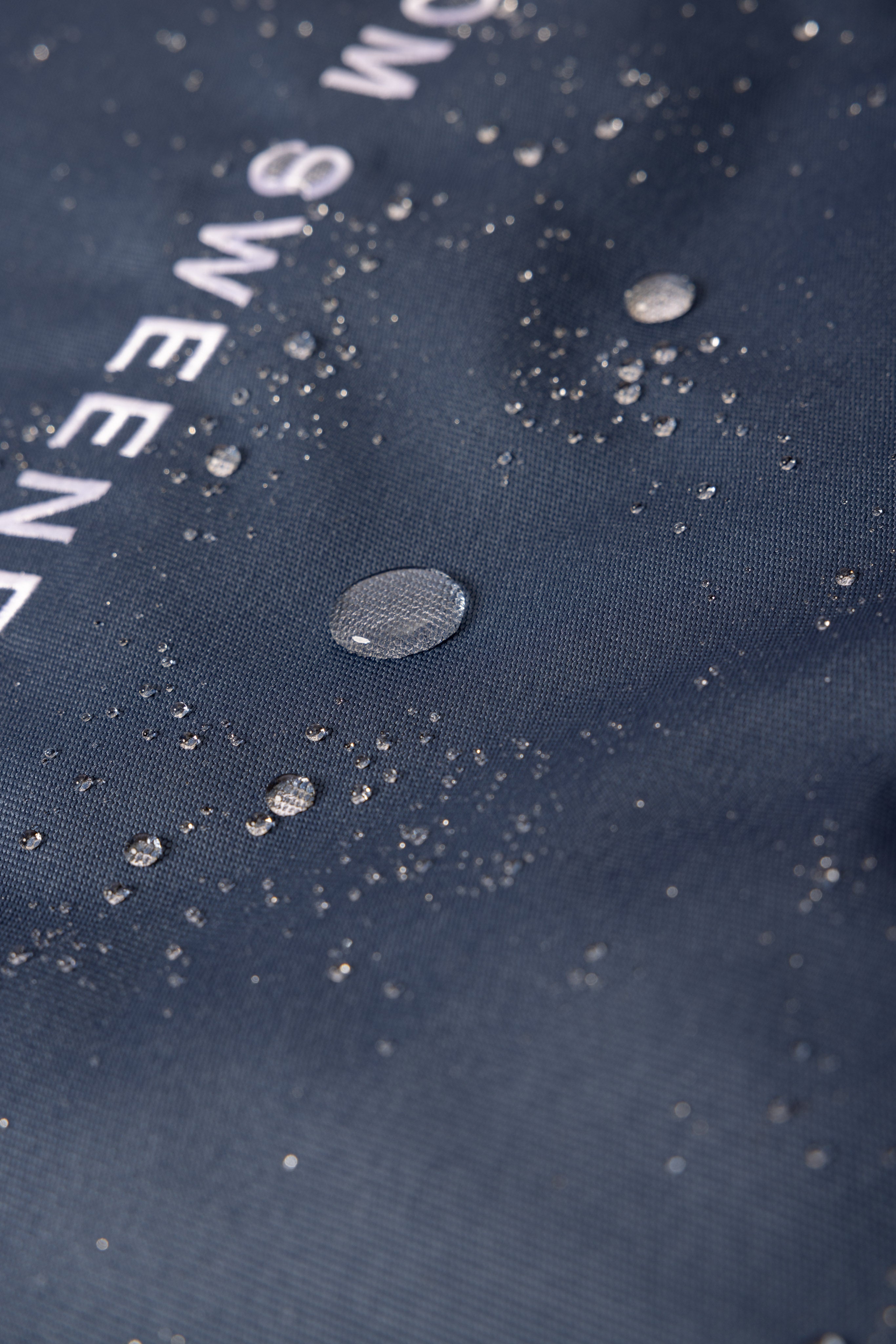 Contrary to plastic shells, our cloth is woven which allows for breathability, but an additional layer of PU is applied on the surface to enable water resitance. This way, smaller air molecules can still pass through but water droplets cannot.