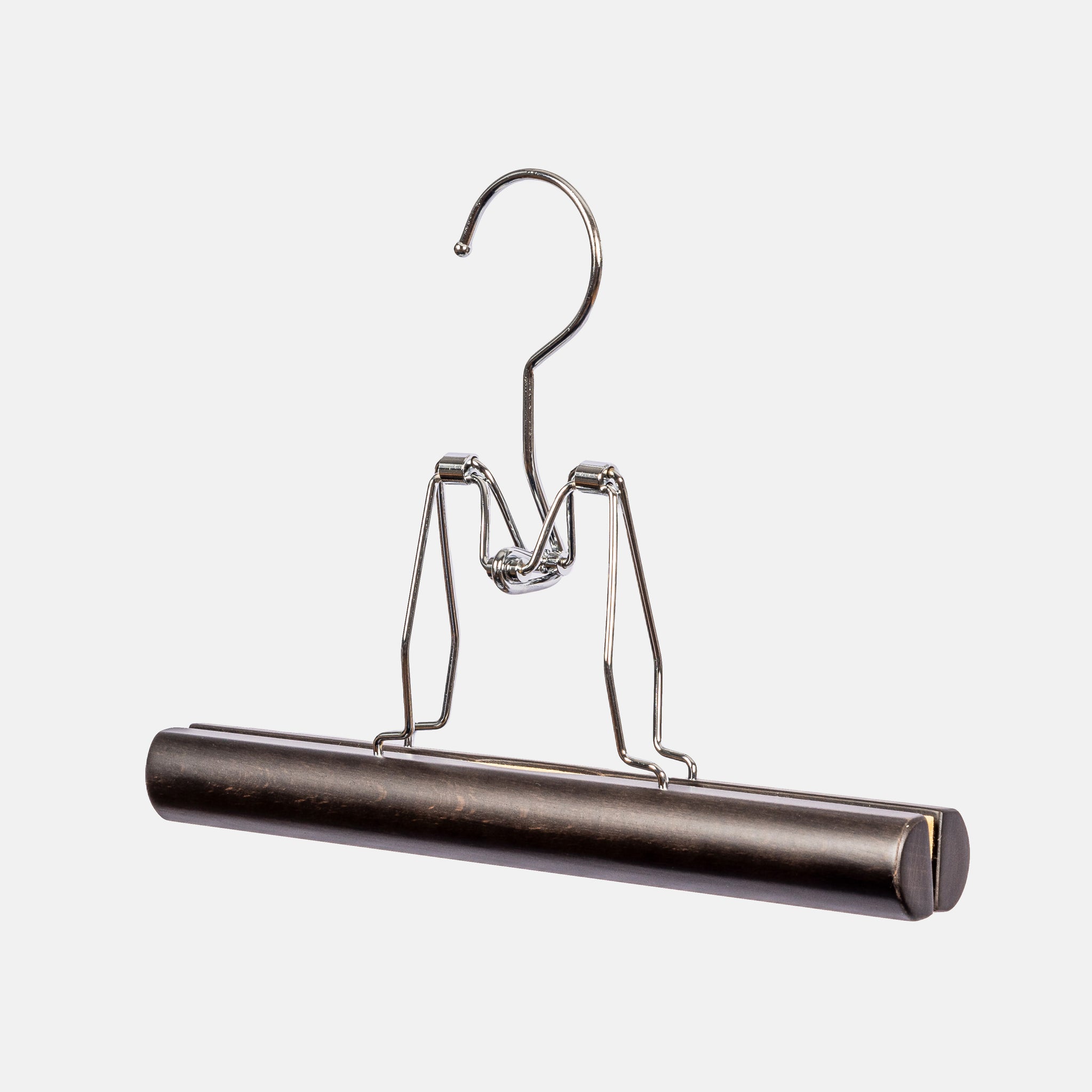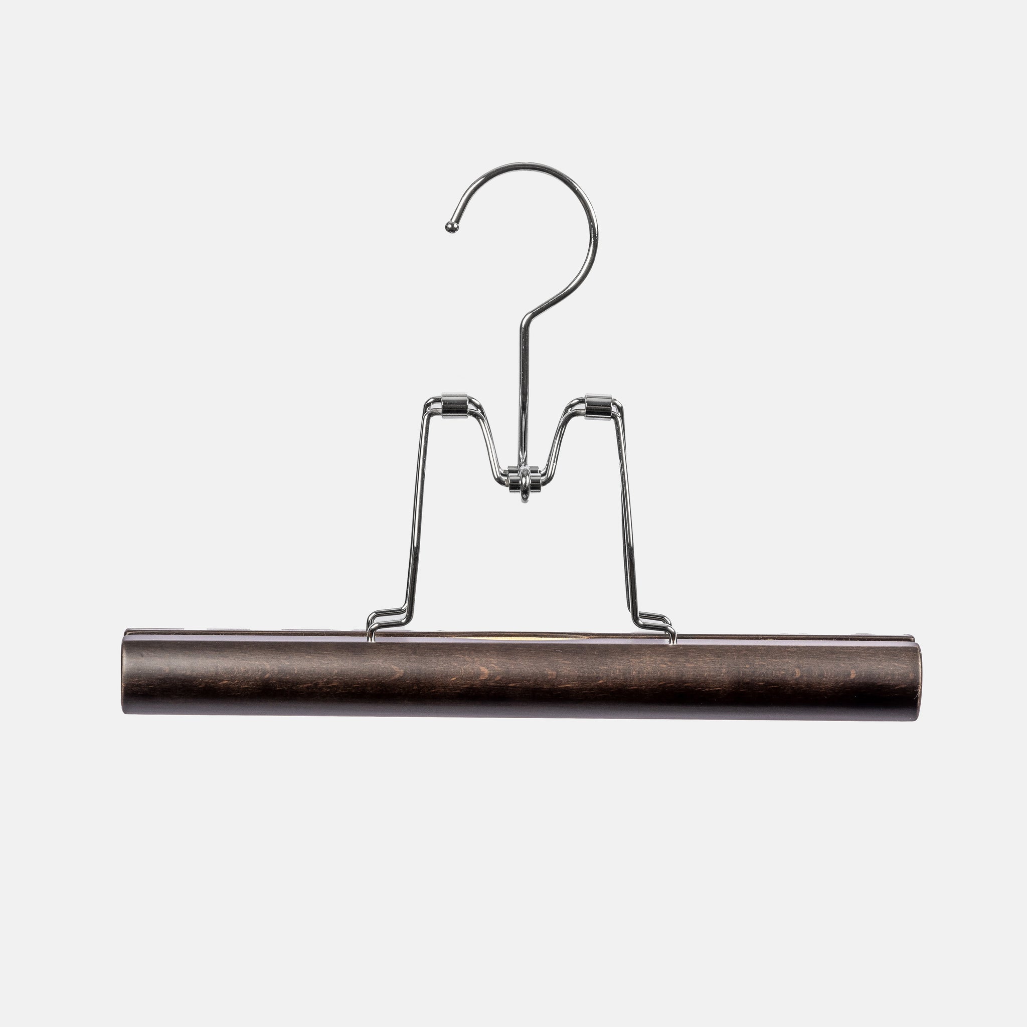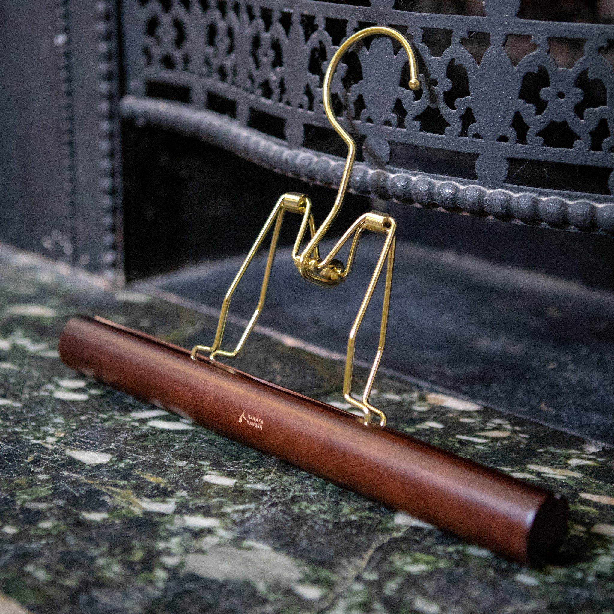 The AUT-07G is a clamp-style trousers hanger by Nakata. Trousers can be hung upside down by the cuffs without being folded. This method circumvents the risk of a centre fold-line and allows wrinkles to dissipate by way of gravity using the full weight of the trousers.