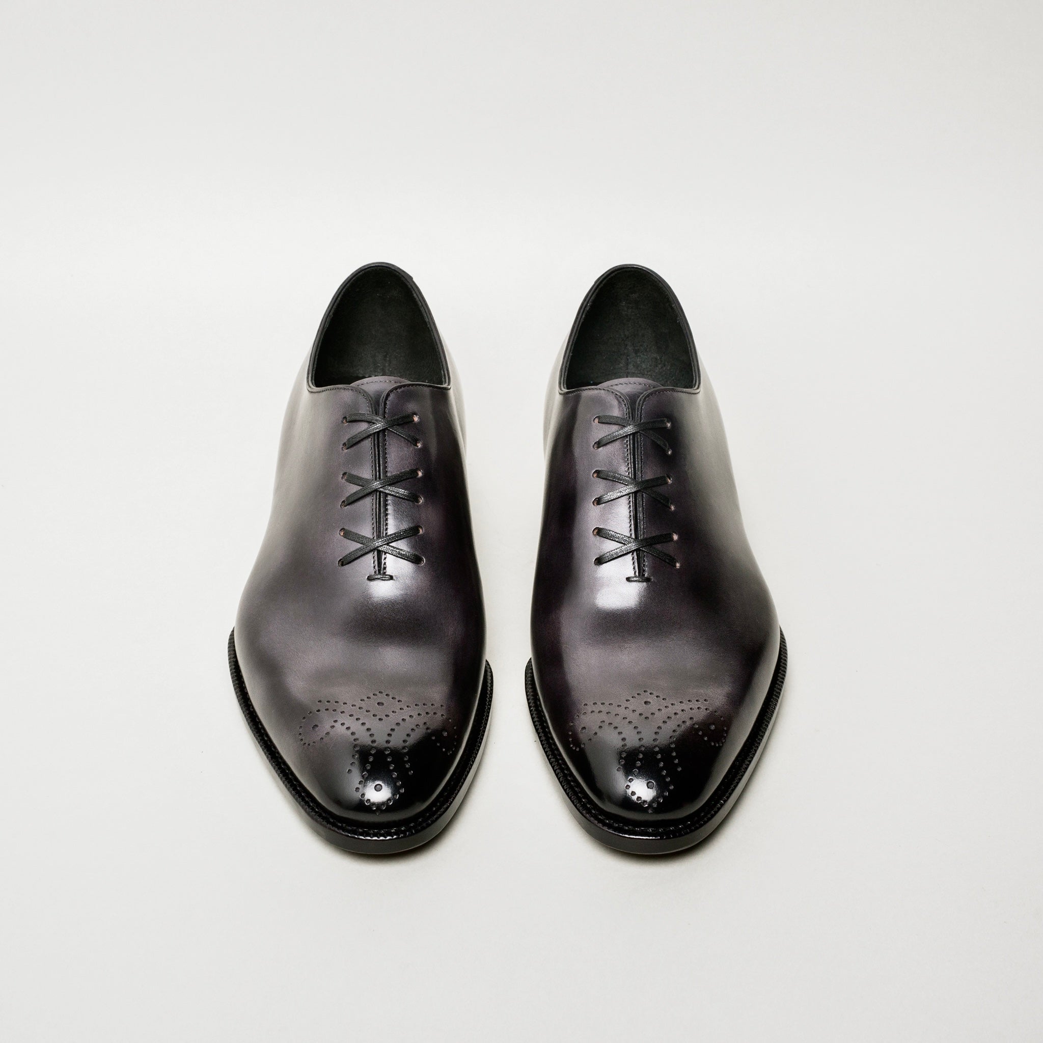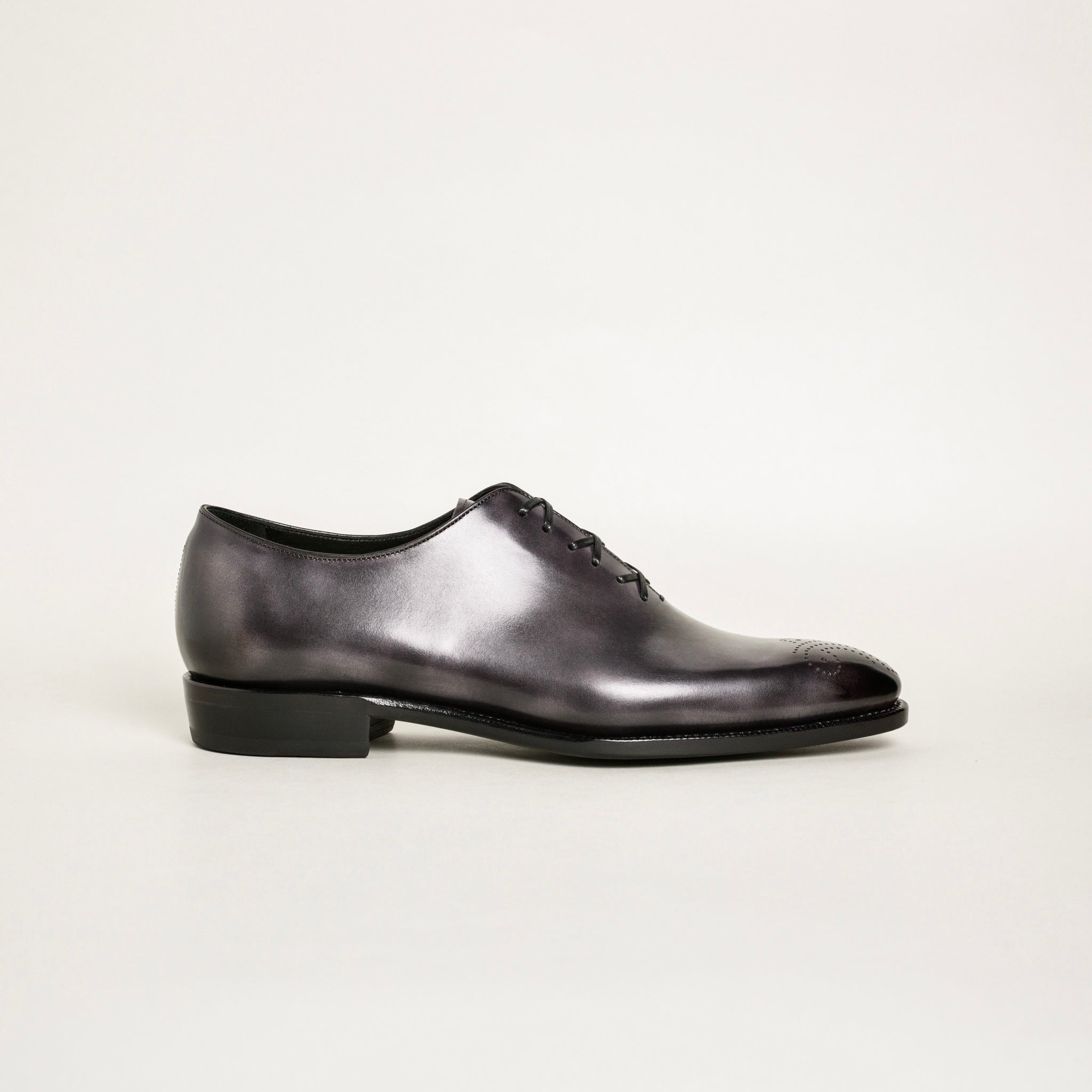 This oxford elevates a classic black oxford design by adding musuem calf patina and punching details at the toe.