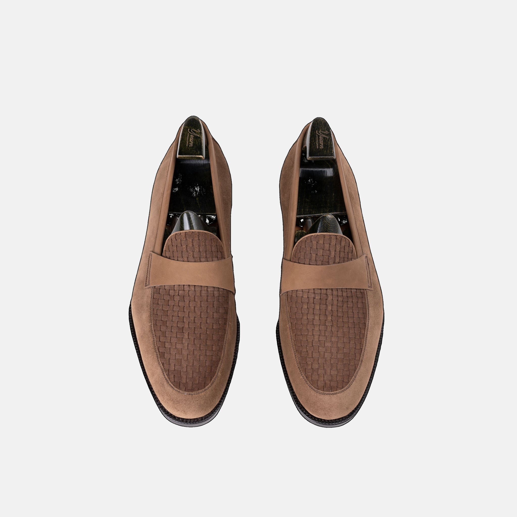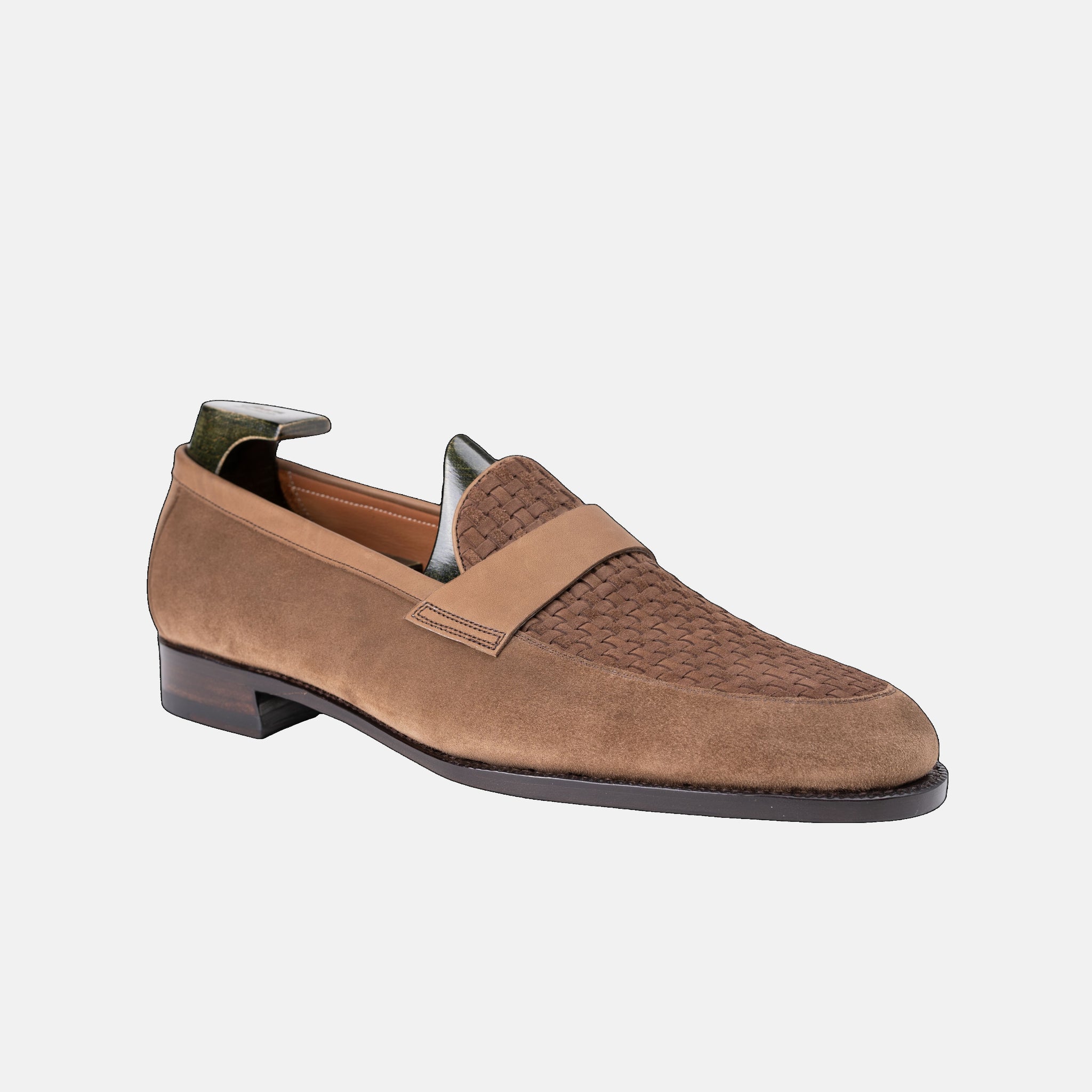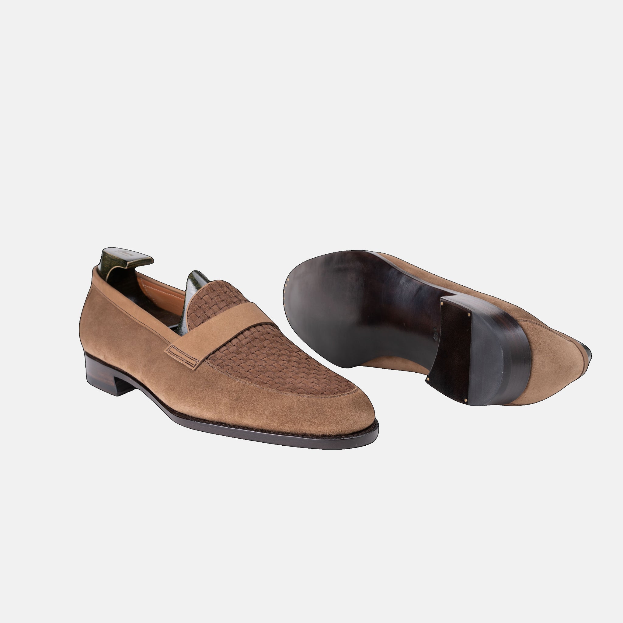 Made from premium Italian baby calf suede, the vamp features a handwoven leather detail, subtly referencing the tradition of braided shoes while reinterpreting it in a more refined, modern context. The rest of the upper is kept clean in smooth suede, creating a balanced contrast that feels effortless yet intentional.